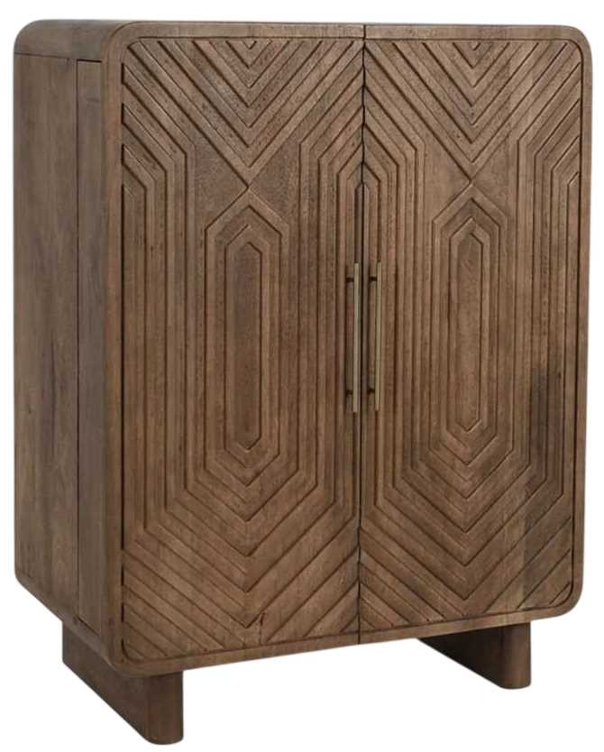 Reminiscent of art deco style, this bar cabinet boasts a handsome geometric pattern carved into each of its doors. Adjustable shelves and a wine rack offer ample space for serving ware, linens, cocktail ingredients, or wine.Read More